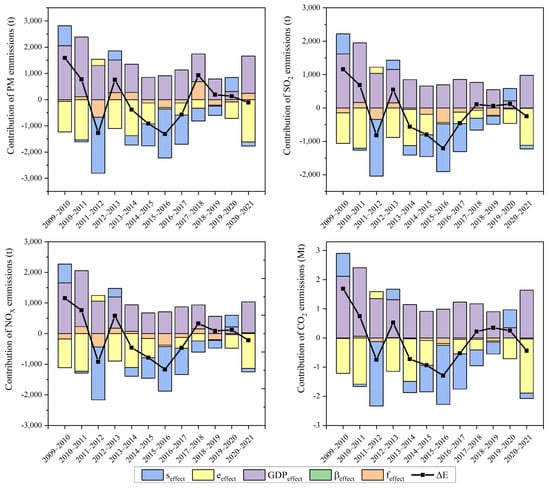 The contribution of various factors to the change in pollutant emissions was subsequently determined. A positive value meant that the pollutant emissions had increased, and a negative value meant that the emissions had decreased.