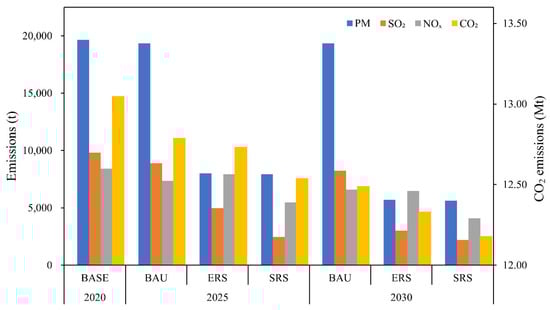 The baseline scenario assumes that control technologies are maintained at the 2020 level and that emission factors and overall output are stable. The output of different goods may increase or decrease, and the structure of refractory products is related to emissions. PM, SO2, NOx, and CO2 emissions are projected to decrease by 1.6%, 16.2%, 21.7%, and 4.3%, respectively, by 2030. Energy consumption limits per unit product for refractory raw materials and for refractory products are specified in the “Standard Conditions for Refractory Industry” (2014) guidelines []. Shandong, Liaoning, Henan, and other important provinces that produce refractories have established emissions limits [,,]. PM, SO2, and NOx emissions from furnaces belonging to refractory enterprises may not exceed the limits specified in the Technical Guide for the Designation of Emergency Emission Reduction Measures for Key Industries in Heavy Pollution Weather (2020 Revision) []. PM, SO2, and NOx emissions from Grade A enterprises may not exceed 10, 50, and 50 mg m−3, respectively.