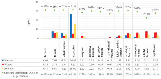 m,p-xylene was determined to be the most prevalent VOC among those evaluated in the research area (Figure 2). The average concentration in the summer was 26.89 µg/m3, and the average concentration in the winter was 5.11 µg/m3. The combustion process of engines and traffic is the main cause of the preponderance of xylene, as the majority of cars are powered by gasoline or diesel. As of 2024, the proportions of vehicles registered for use in Turkey were as follows: 34.1% diesel automobiles, 31.9% LPG cars, 30.2% gasoline-powered cars, 2.4% hybrid cars, and 1.1% electric cars. The percentage of cars with an unknown fuel type was 0.2%. Heavy commercial vehicles are fueled by diesel and liquefied natural gas (LNG) [43]. Diesel internal combustion engine emissions, evaporative emissions of gasoline, natural gas combustion, and vehicle exhaust are the largest contributors to ambient levels of VOCs [44]. According to the study by Srivastava et al., xylene is the primary species that differs between the exhaust of gasoline and diesel vehicles, with diesel exhaust being the primary source of xylene [45]. Dilovası, which was chosen as the study area, is one of the most important industrial areas in Kocaeli. It is located at a strategic point in the transition to Istanbul. It is on the route of the E-5 and Northern Marmara Motorway. Its status as a port city also makes it a frequent route for huge commercial vehicles. The daytime population increases due to thousands of employees coming to work in the industrial establishments in the district. Therefore, there is always heavy traffic in the district. This naturally makes xylene dominant.