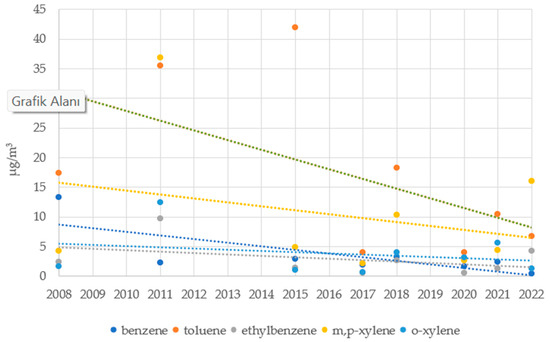 The study’s results were compared to those of other studies by Ergenekon et al. (2009), Pekey and Yılmaz (2011), and Pekey et al. (2015), which were carried out in the same district in the past, as well as with measurement results requested by an official letter from the Marmara Clean Air Center Directorate [19,22,46]. The results are shown in Figure 3. The ΣBTEX concentration, which was found to have an average of 28.72 µg/m3 in this study, was between 9.31 and 96.82 µg/m3 in prior years. When analyzed in terms of pollutant type dominance, Pekey and Yılmaz (2011) stated that xylene was a dominant pollutant, which aligns with the findings of this study [19]. According to research by Ergenekon et al. (2009) and Pekey et al. (2015), the concentration of toluene was found to be higher than that of other VOCs, indicating a particular level of VOC pollution [22,46]. It is an expected result that variations in concentration will occur based on the pollutant type and the year. The differences can be partly explained by differences in sampling strategy (sampling frequency, sampling period, and sampler type), but also by traffic, stationary emission sources, and meteorological conditions.