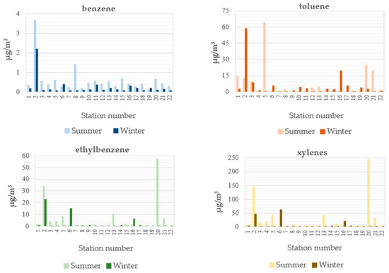 When the seasonal changes in BTEX concentrations were examined per station (Figure 4), it was observed that the seasonal changes in all compounds were not uniform. Although the average concentrations of benzene, toluene, ethylbenzene, and m,p-xylene, based on data from 22 stations, were found to be higher in the summer than in the winter (Figure 2), it was also observed that there were stations where concentrations were higher in the winter than in the summer. Specifically, benzene concentrations were higher at two measurement points (6 and 19); toluene at ten points (2, 6, 9, 10, 11, 14, 15, 16, 17, 19); ethyl benzene at six points (6, 9, 14, 16, 17, 19); and xylene at six points (6, 9, 14, 16, 17, 19).