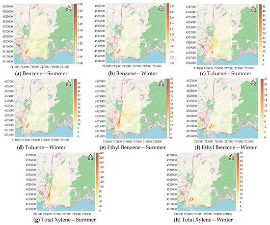Distribution maps were created for pollutants whose concentrations were determined at 22 measurement points and the distribution maps of ΣBTEX for the summer and winter seasons are given in Figure 5. Examining Figure 5, it is evident that the highly inhabited area where housing, industry, and traffic are linked has a higher concentration. In terms of ΣBTEX concentrations, the region where the 2nd measurement point, 5th measurement point, and 20th measurement point are located is particularly noteworthy. In the summer, the concentration reached 326 µg/m3 in this region and 130 µg/m3 in the winter. This area has heavy traffic, high-density buildings, and small industrial areas. The results can be attributed to these sources.