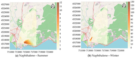 Among the VOCs measured in the study area, distribution maps for naphthalene were created in addition to BTEX, and the maps are presented in Figure 7. When analyzing the maps, it can be seen that the first measurement point has the highest concentration of naphthalene in the summer (12.16 µg/m3), while the second measurement point shows the highest concentration in the winter (137.33 µg/m3). This seasonal variation in concentration is thought-provoking. Sources of naphthalene in open air mostly come from fugitive emissions and motor vehicle exhaust. Naphthalene is released into the atmosphere by evaporation, photolysis, adsorption, biodegradation, and land and water spills that occur during the storage, transportation, and disposal of coal tar and fuel oil [51]. As a result, the measurements of naphthalene conducted during this study point to fugitive emissions.