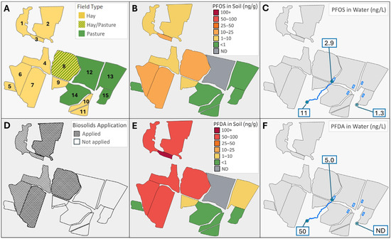 Site overview map with (A) numbered farm fields by use, (B) fieldwide composite soil PFOS concentrations, (C) PFOS concentrations measured in untreated well water and two surface water bodies accessible from pastures, (D) biosolids application history by field, (E) fieldwide composite soil PFDA concentrations, and (F) PFDA concentrations measured in untreated well water and two surface water bodies accessible from pastures.