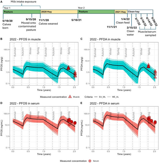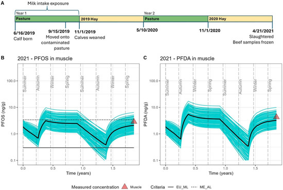 Cattle lifespans were modeled using site-specific exposure information described above, with separate runs for each year in which biomonitoring was conducted. One hundred stochastic simulations were performed to account for individual heterogeneity in toxicokinetic parameters and variation in feed and water intake. Each simulation used a different random draw from normal distributions for the toxicokinetic parameters; means and standard deviations are presented in Table 3. Additionally, predicted feed and water intakes were allowed to vary by 30%, as described by Mikkonen et al. [30]. For each model run, the mean and standard deviation of the 100 simulations were calculated and compared to the mean and standard deviation of the measured muscle and/or serum data from the relevant biomonitoring year. Model results are presented graphically to illustrate variation among individual simulations and overlaid with the observed biomonitoring data and reference lines for published action levels for PFOS in beef muscle. The upper reference line at 3.4 ng/g refers to the beef action level derived by the state of Maine in 2020 [47]. The lower line at 0.3 ng/g refers to the European Union (EU) maximum limit published in 2022 [48]. Action levels do not yet exist for PFDA in beef muscle.
