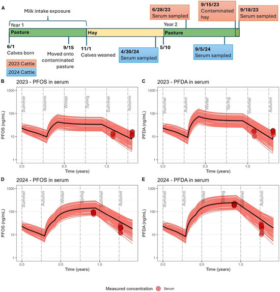 The 2023 and 2024 exposure scenarios. (A) Timeline detailing exposure histories for two groups of cattle sampled at around 12 to 18 months of age, with events specific to the 2023 cattle group (n = 6) shown in red and events specific to the 2024 cattle group (n = 8) shown in blue. (B) Estimated PFOS concentrations in serum for the 2023 cattle. (C) Estimated PFDA concentrations in serum for the 2023 cattle. (D) Estimated PFOS concentrations in serum for the 2024 cattle. (E) Estimated PFDA concentrations in serum for the 2024 cattle. DE_PopTK-model-estimated concentrations over time are provided as 100 individual stochastic simulations represented by red lines with the median estimate presented as a black line. Measured PFAS concentrations in serum are presented as red circles.