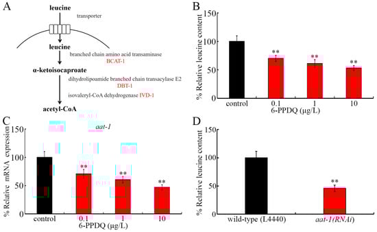 The effect of 6-PPDQ exposure on leucine content and adsorption. (A) A diagram showing leucine adsorption and catabolism in C. elegans. (B) The effect of 6-PPDQ exposure on leucine content. ** p < 0.01 vs. control. (C) The effect of 6-PPDQ exposure on intestinal aat-1 expression. ** p < 0.01 vs. control. Thirty intact intestines were isolated for qRT-PCR analysis. (D) The effect of RNAi of aat-1 on leucine content in 6-PPDQ-exposed nematodes. The exposure concentration of 6-PPDQ was 10 μg/L. ** p < 0.01 vs. wild-type (L4440).
