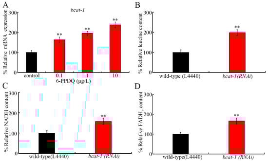 Effect of 6-PPDQ exposure on leucine catabolism. (A) Effect of 6-PPDQ exposure on bcat-1 expression. ** p < 0.01 vs. control. (B) Effect of RNAi of bcat-1 on leucine content in 6-PPDQ-exposed nematodes. Exposure concentration of 6-PPDQ was 10 μg/L. ** p < 0.01 vs. wild-type (L4440). (C) Effect of RNAi of bcat-1 on NADH content in 6-PPDQ-exposed nematodes. Exposure concentration of 6-PPDQ was 10 μg/L. ** p < 0.01 vs. wild-type (L4440). (D) Effect of RNAi of bcat-1 on FADH2 content in 6-PPDQ-exposed nematodes. Exposure concentration of 6-PPDQ was 10 μg/L. ** p < 0.01 vs. wild-type (L4440).