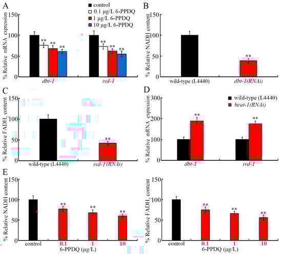 Considering the possible important role of DBT-1 and IVD-1 for the generation of NADH and FADH2 [,], we next investigated the effect of 6-PPDQ on the expressions of dbt-1 and ivd-1. The expressions of dbt-1 and ivd-1 were decreased by 0.1–10 μg/L of 6-PPDQ in wild-type nematodes (Figure 3A). After 6-PPDQ exposure, the NADH content could be reduced by RNAi of dbt-1 (Figure 3B), and the FADH2 content could be reduced by the RNAi of ivd-1 (Figure 3C). Moreover, after 6-PPDQ exposure, dbt-1 and ivd-1 expressions were increased by bcat-1 RNAi (Figure 3D). In 6-PPDQ-exposed wild-type nematodes, the NADH and FADH2 contents showed a tendency towards reduction (Figure 3E).