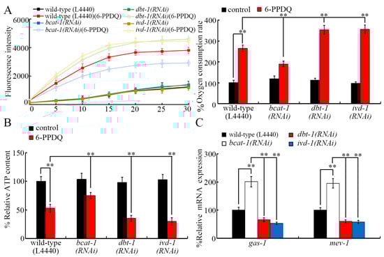 After 6-PPDQ exposure, mitochondrial dysfunction was induced []. The 6-PPDQ-induced increase in the oxygen consumption rate was inhibited by the RNAi of bcat-1 and was enhanced by the RNAi of dbt-1 and ivd-1 (Figure 4A). The 6-PPDQ-caused decrease in the ATP content was suppressed by the RNAi of bcat-1 and strengthened by the RNAi of dbt-1 and ivd-1 (Figure 4B). GAS-1 (complex I component) and MEV-1 (complex II component) were involved in controlling 6-PPDQ-induced mitochondrial dysfunction []. Moreover, after 6-PPDQ exposure, gas-1 and mev-1 expressions were increased by bcat-1 RNAi and decreased by dbt-1 and ivd-1 RNAi (Figure 4C).