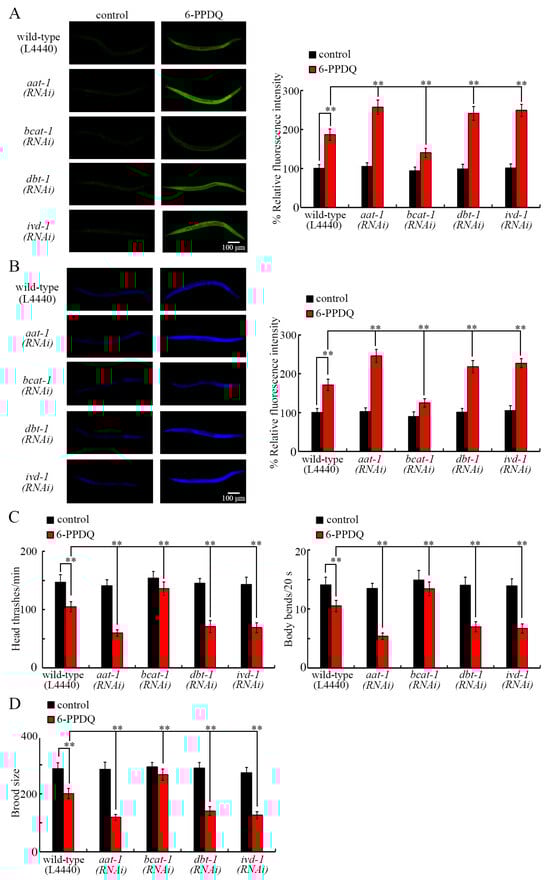 We further investigated the effect of aat-1, bcat-1, dbt-1, and ivd-1 RNAi on other 6-PPDQ-induced aspects of toxicity. Intestinal toxicity could be induced by 6-PPDQ, reflected by intestinal ROS generation and lipofuscin accumulation []. After 6-PPDQ exposure, induced intestinal ROS generation and lipofuscin accumulation were enhanced by the RNAi of aat-1, dbt-1, and ivd-1, and inhibited by the RNAi of bcat-1 (Figure 5A,B). Exposure to 6-PPDQ also caused neurotoxicity reflected by inhibited locomotion [] and reproductive toxicity reflected by reduced brood size [], which were strengthened by aat-1, dbt-1, and ivd-1 RNAi and suppressed by bcat-1 RNAi (Figure 5C,D).