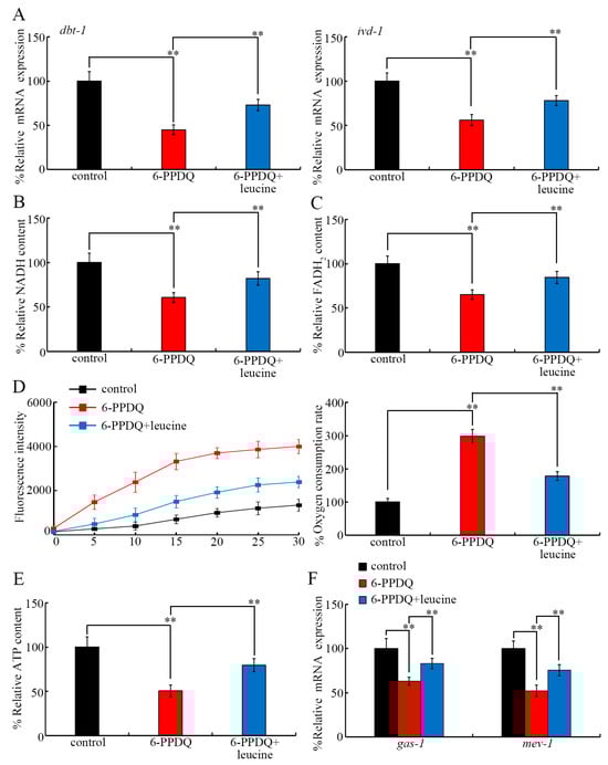 Effect of treatment with leucine (5 mM) on toxicity of 6-PPDQ (10 μg/L) in affecting expressions of dbt-1 and ivd-1 (A), NADH content (B), FADH2 content (C), oxygen consumption rate (D), ATP content (E), and expressions of gas-1 and mev-1 (F). ** p < 0.01.