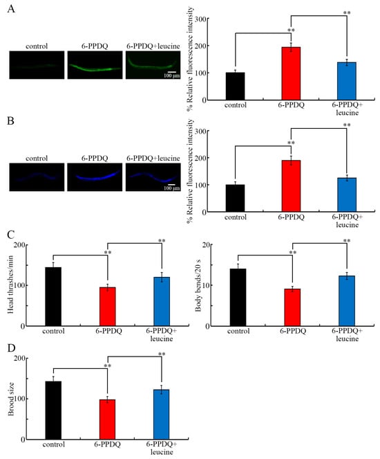 Effect of treatment with leucine (5 mM) on toxicity of 6-PPDQ (10 μg/L) in inducing intestinal ROS generation (A), causing intestinal lipofuscin accumulation (B), decreasing locomotion (C), and reducing brood size (D). ** p < 0.01.
