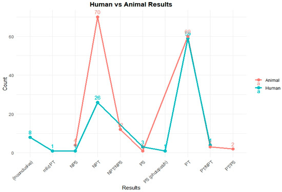 Comparison of photosafety results from human and animal tests in the PhotoChem DB. This figure shows the photosafety results for reference chemicals based on human and animal test data. In animal studies, most compounds were clearly categorized as either non-phototoxic (NPT) or phototoxic (PT). In contrast, human data included a broader range of outcomes such as inconclusive results, mild reactions, or photosensitization (photopatch), reflecting the complexity of clinical assessments.