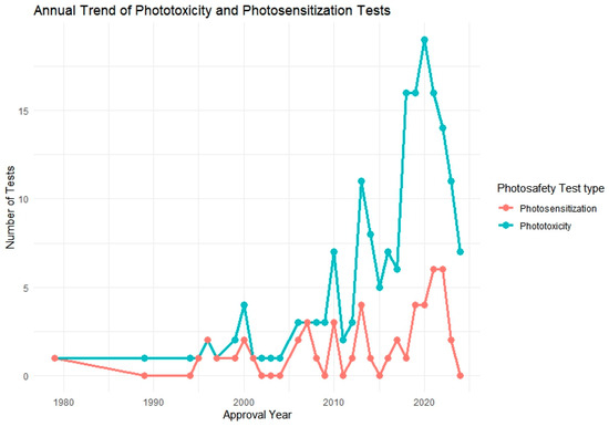 Annual trend of phototoxicity and photosensitization testing among approved pharmaceutical products (n = 106). The graph illustrates the increasing frequency of photosafety testing over the years, particularly for phototoxicity since the mid-2000s.
