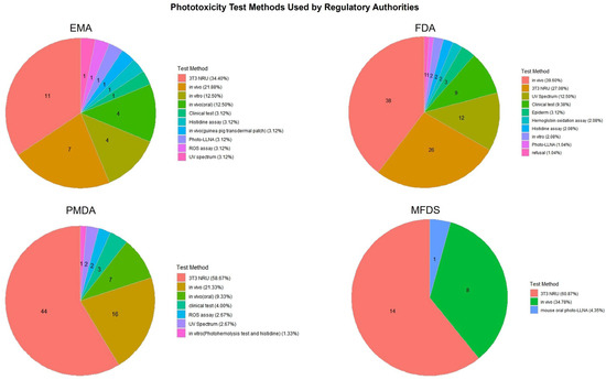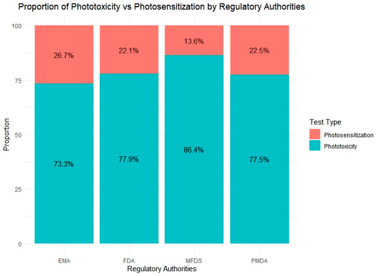 Figure 6 provides a comparative overview of the relative proportion of phototoxicity and photosensitization tests conducted by four regulatory agencies: the EMA, FDA, PMDA, and MFDS. Across all countries, phototoxicity assessments represented the dominant form of photosafety testing, reflecting its broader regulatory adoption and the availability of validated test guidelines such as OECD TG 432.