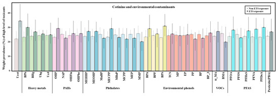 Previous studies have primarily focused on health effects related to ETS [7,8]; however, the relationship between ETS exposure and the burden of diverse environmental contaminants, including heavy metals, polycyclic aromatic hydrocarbons (PAHs), phthalates, phenols, and volatile organic compounds (VOCs), has rarely been investigated among adolescents. Given that tobacco combustion can generate and release various environmental chemicals, quantifying their accumulation in adolescent populations exposed to ETS is crucial for understanding potential health risks and informing adolescent health. The toxicological value of this study is the comprehensive analysis of ETS-related exposures to multiple environmental contaminants, using urinary cotinine as a quantitative biomarker of tobacco smoke exposure. Cotinine, a stable metabolite of nicotine, provides an objective and precise measure of ETS exposure levels [9].