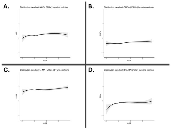 Distribution trends of environmental chemicals by urinary cotinine levels. All data were log-transformed. (A) PAHs (polycyclic aromatic hydrocarbons): 2-naphthol (NAP) (B) PAHs: 2-hydroxyfluorene (OHFlu). (C) VOCs (volatile organic compounds): trans,trans-muconic acid (t,t-MA). (D) Phenols: bisphenol A (BPA).