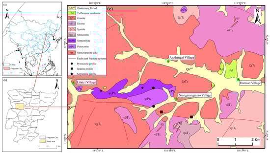 Geographical and geological setting of the study area: (a) Worldwide geographical location of China and Pingquan city; (b) Geographical location of Pingquan city in Hebei province; (c) Simplified geological map of the study area with the locations of the sampling profiles (modified from the 1:50,000 geological map by the Fifth Team, Hebei Regional Geological and Mineral Survey Institute).