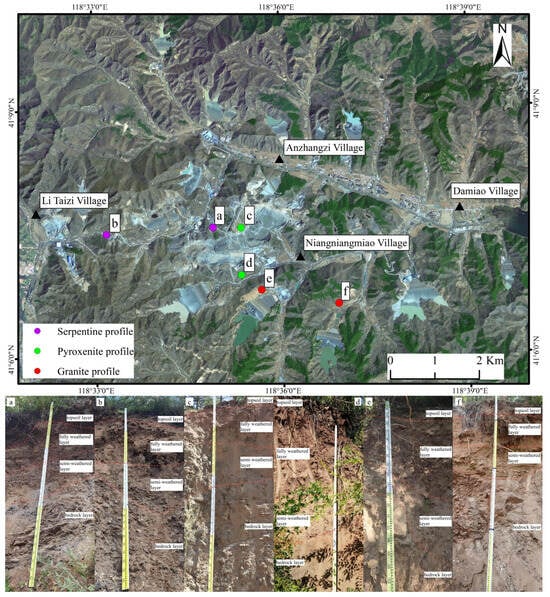 To investigate the distribution of heavy metals in weathering crusts inside and outside the mining area, two weathering profiles (serpentinite and pyroxenite) were established within the mining pit, and one granite weathering profile—unaffected by tailings activities—was sampled at the crest of a tailings reservoir adjacent to the east–west axis of the pit as inner-mining profiles. For outer-mining profiles, three weathering profiles (serpentinite, pyroxenite, and granite) were selected at sites including the roadside of transport routes and the base of tailings reservoirs (Figure 2). The remote sensing imagery dataset was obtained from the Geospatial Data Cloud Platform, using Landsat-9 imagery (https://www.gscloud.cn/ (accessed on 1 May 2025)). The data was acquired in April 2024 with a spatial resolution of 15 m. Sampling was conducted in August, with profile depths varying across sites. Stratified sampling included: one sample from the topsoil layer (0 m to 0.4 m), three samples from the fully weathered layer (0.4 m to 1.4 m), three samples from the semi-weathered layer (1.4 m to 2.3 m), and one fresh bedrock sample. A total of 48 samples were collected from six profiles, all following standardized protocols. Samples were labeled sequentially and transported to the laboratory for analysis.