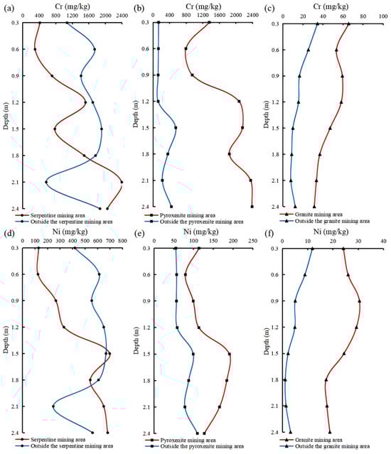 Vertical distribution of Cr and Ni concentrations in weathering crust profiles (Cr is at the top—profiles (a–c); Ni is at the bottom—profiles (d–f)).