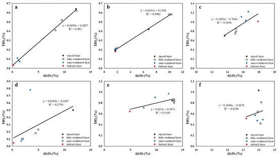 Scatter plots of TiO2 vs. Al2O3 in weathering crust profiles ((a–c): serpentinite, pyroxenite, and granite profiles within the mining area; (d–f): serpentinite, pyroxenite, and granite profiles outside the mining area).