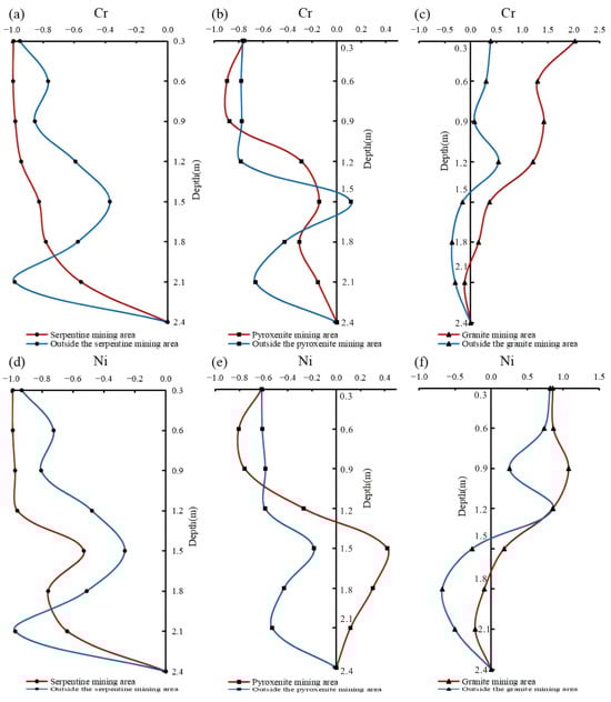 As depicted in Figure 5, Cr demonstrates overall depletion in serpentine and pyroxenite profiles. Depletion is more pronounced in serpentine profiles within the mining area compared to external areas, whereas pyroxenite profiles show the reverse trend. Notably, Cr enrichment occurs in granite profiles. Migration coefficients are overall higher inside the mining area compared to external areas, with substantial variability observed in vertical migration coefficients across the six weathering crust profiles, as detailed below: ① Within mining-area serpentine profiles, the topsoil, full-weathering, and saprolite layers exhibit profound depletion, with depletion intensity gradually diminishing from surface to subsurface. In pyroxenite profiles, the topsoil and full-weathering layers show drastic depletion, whereas depletion in saprolite layers declines abruptly. ② In extra-mining serpentine and pyroxenite profiles, comparable trends emerge: depletion diminishes gradually in horizons above the saprolite layer while increasing abruptly in deeper strata. ③ Granite profiles show consistent curve distribution patterns: migration coefficients decline progressively from surface to subsurface, with the saprolite layer exhibiting dynamic equilibrium between enrichment and depletion. Overall, Cr demonstrates limited migration and enrichment capacity during pedogenesis in mining-area serpentine and pyroxenite, whereas these processes are more pronounced outside the mining area. Indirect mining activities drive Cr enrichment in the transition zone between fully weathered and saprolite layers. Notably, higher migration coefficients in wall rocks surrounding ore-forming bodies warrant attention to the Cr excessive activity of ecological elements in this region.