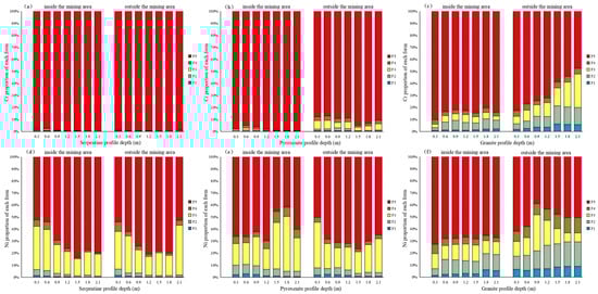 Vertical distribution of Cr and Ni speciation in weathering crust profiles. F1—exchangeable; F2—carbonate-bound; F3—Fe/Mn oxide-bound; F4—organic-bound; and F5—residual ((a–c): proportions of various speciations of Cr in serpentinite, pyroxenite, and granite profiles; (d–f): proportions of various speciations of Ni in serpentinite, pyroxenite, and granite profiles).