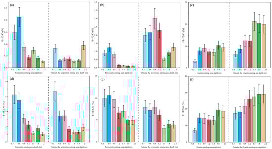 As depicted in Figure 6d–f, Ni speciation exhibits marked differences from Cr, with distinct patterns: ① Serpentine profiles in the mining area show elevated F3 (Fe/Mn oxide-bound) fractions, decreasing systematically from topsoil (5.12%) to full-weathering (2.61%) and saprolite layers (1.25%). ② Pyroxenite profiles mirror serpentine speciation trends, though with lower F5 (residual) proportions and a notable F2 (carbonate-bound) increase to 5.15%. ③ Granite profiles show F3 depletion and F2 enrichment, with higher F2 values consistently observed outside versus inside the mining area.
