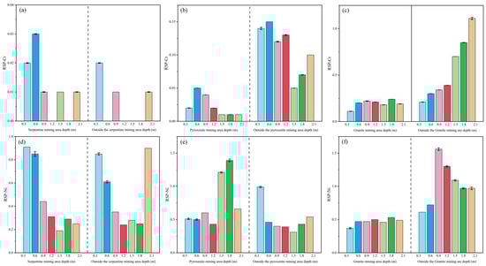 RSP Assessment Plots for Cr and Ni in Weathering Crust Profiles (Cr is at the top—profiles (a–c); Ni is at the bottom—profiles (d–f)).
