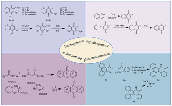 1,4 Benzoquinone was synthesized using a two-step process. In the first step, compound 1 was reacted with paraformaldehyde in different solvents (37% hydrochloric acid, 47% hydrogen bromide, morpholine, and piperidine) for 2 h at 35 °C to give compounds 2a–2d in high yields. The second step involved the oxidation of compounds 1a–1d with cerium ammonium nitrate (CAN) at room temperature to obtain the desired compounds 2a–2d in good yields. This method is short, high-yield, and easy to post-process []. Figure 3 introduces the synthetic pathways of quinone compounds.
