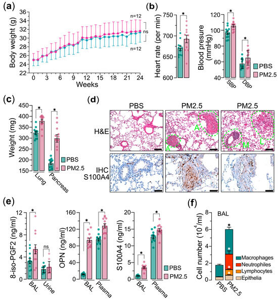 PM2.5 exposure mouse model experiments. Mice (n = 24) were administered 25 μg of PM2.5 samples (n = 12) or physiological saline (n = 12) via oropharyngeal aspiration twice per week and were euthanized 24 weeks after the initial PM2.5 treatment. (a) Measurements of mice’s body weights. (b) Measurements of mice’s heart rate (left) and blood pressure (SBP and DBP are indicated) (right) prior to euthanasia. (c) Measurements of the organs of lungs and pancreases as indicated. (d) Hematoxylin and eosin (H&E) and immunohistochemistry (IHC) analyses of lung tissues of mice. In H&E, A indicates angiogenesis; L indicates leukocyte infiltration; M indicates macrophage activation. In IHC, the lung tissues are marked with specific antibody anti-S100A4. (e) Measurements of 8-iso-PGF2 (left), OPN (middle), and S100A4 (right) in bronchoalveolar lavage (BAL), urine, or plasma, as indicated. (f) Cell composition in BAL. Immune cells and epithelia cells are indicated. PBS, PBS-treated control mice; PM2.5, PM2.5-treated mice. Data are presented as the mean ± SEM from independent experiments. Unpaired two-tailed Student’s t-tests were performed, with statistical significance defined as p < 0.05 (*); ns, not significant.