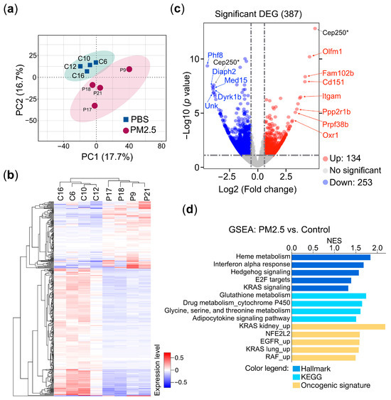 To uncover the underlying mechanisms by which PM2.5 leads to various pathological conditions and to identify the gene sets specifically associated with PM2.5 exposure that could serve as prospective biomarkers, we conducted an unbiased RNA sequencing (RNA-seq) approach to investigate the connections between gene expression and PM2.5 exposure. RNA-sequencing-based transcriptional profiling was performed on total RNA samples extracted from the buffy coat cells of mice exposed to PM2.5 and the control treatment. The principal component analysis (PCA) clearly distinguished the PM2.5 exposure samples from the controls in the two-dimensional PC space (Figure 3a). A heatmap and hierarchical clustering analysis indicated the presence of two distinct clusters of gene expression patterns (group P versus group C) (Figure 3b), suggesting that exposure to PM2.5 induced substantial alterations in the transcriptional landscape. Our RNA-sequencing analysis, visualized as a volcano plot, identified 387 differentially expressed genes (DEGs) between the PM2.5-exposed and PBS-treated mice. Of these, 134 genes were upregulated, while 253 genes were downregulated (Figure 3c). To further validate the DEGs, we selected the top 12 genes, including both upregulated and downregulated genes, and assessed their specific responses to PM2.5 exposure using quantitative reverse transcription PCR (qRT-PCR) in cell line-based experiments. These results are further supported by in vitro cell-based validation (Section 3.3). The gene set enrichment analysis (GSEA) of the DEGs reveals that PM2.5 exposure is associated with multiple pathways related to oncogenesis (KRAS and EGFR signaling), redox homeostasis (glutathione and NFE2 signaling), inflammatory response (interferon alpha response), and metabolism (drug metabolism and P450 cytochrome P450 and amino acid metabolism) (Figure 3d), demonstrating the wide-ranging physiological and pathological impacts.