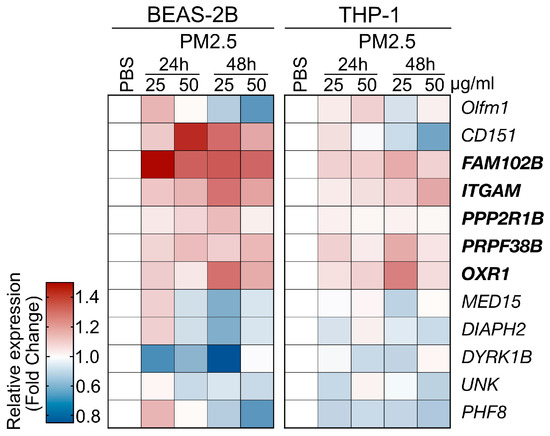 Cell line-based validation for the PM2.5-induced genes identified by RNA-Seq analysis. Two human cell lines, BEAS-2B and THP-1 cells, were used to assess the responses to PM2.5 treatment. The cells were treated with PM2.5 samples at concentrations of 25 μg/mL or 50 μg/mL for 24 h or 48 has indicated. The heatmap depicts the relative gene expression levels, with the tested genes marked.