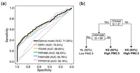 Gene expression levels (Q values)-based prediction of PM2.5 exposure: model performance and decision rules. (a) Receiver operating characteristic (ROC) curves and corresponding area under the curve (AUC) values for logistic regression models based on individual genes and the optimal multivariate combination. (b) Decision rules from a tree constructed via recursive partitioning and pruning, which retained ITGAM and PRPF38B as the most informative predictors. Samples with ITGAM Q ≥ 21 were classified as high exposure (KS) with 92% accuracy. When ITGAM Q < 21 and PRPF38B Q ≥ 66, the model also predicted high exposure with 92% accuracy. Conversely, when both ITGAM Q < 21 and PRP38B Q < 66, the predicted probability of belonging to the low exposure group (HL) was 60%.