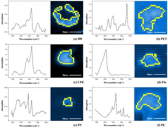 LD-IR scanning images of typical microplastics in semen (yellow outline) and the corresponding infrared spectrum. (a) Butadiene rubber, BR; (b) polyethylene terephthalate, PET; (c) chlorinated polyethylene, CPE; (d) fluororubber, Flu; (e) polypropylene, PP; (f) Polyethylene, PE.
