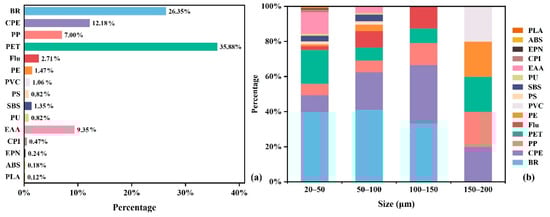 The polymer compositions of microplastics are shown in Figure 2a. A total of 15 distinct MP polymers were identified and verified. In all MP particles, PET accounted for 35.9% of the total amount followed by BR (26.4%) and CPE (12.2%). MP polymer types differed by size category. As shown in Figure 2b, BR (39.8%) and PET (19.4%) were the predominant polymers in the size range of 20–50 μm. However, in the size ranges of 50–100 μm and 100–150 μm, BR and CPE were the main MPs polymers. The compositions of MP polymer types within different size ranges is comprehensively presented in Table S2.