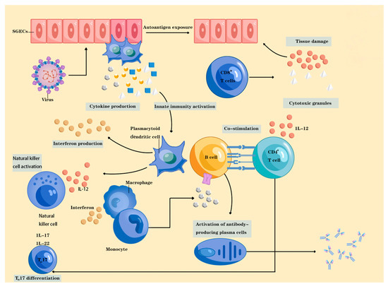 Sjogren syndrome (SS) is a chronic autoimmune disorder characterized by lymphocyte proliferation and the immune-mediated destruction of exocrine glands, predominantly the salivary and lacrimal glands, causing the disease hallmarks of severe dryness of the eyes and mouth, also denoted ‘sicca symptoms’ [1]. In addition to the glandular symptoms, patients with SS may also present articular, cutaneous, pulmonary, renal and muscular complications [2]. The presence of autoantibodies and hyperglobulinemia are serological characteristics observed in individuals with SS. SS is divided into secondary SS and primary SS (pSS) according to whether it is accompanied by other connective tissue diseases. The former is often secondary to systemic lupus erythematosus (SLE), rheumatoid arthritis (RA) and other pathologies. The prevalence of SS is approximately 35 million individuals worldwide, and extraglandular manifestations such as non-Hodgkin’s lymphoma develop in around 30% to 50% of patients [3]. The precise etiology and pathogenesis of pSS remain elusive. Currently, it is postulated that the action of external factors such as viral infections, sex hormones and environmental influences in individuals with genetic susceptibility, leading to immune dysregulation, is the fundamental mechanism of disease onset [4]. In genetically susceptible individuals, viral infection is thought to trigger the activation of salivary gland epithelial cells (SGECs), which results in innate immune system activation and ultimately leads to intensive crosstalk between innate and adaptive immune cells. Activated SGECs can function as antigen-presenting cells and produce a specific cytokine milieu, including IL-6, type I interferon, CXCL12, B cell activating factor and a proliferation-inducing ligand, ultimately inducing the homing of immune cells to the salivary glands, type I interferon’s overexpression by plasmacytoid dendritic cells and the promotion of B cell differentiation and survival. This causes the chronic release of autoantigens, which in turn stimulate innate immunity activation in a vicious circle [1]. Figure 1 summarizes the pathogenesis of Sjogren’s syndrome.
