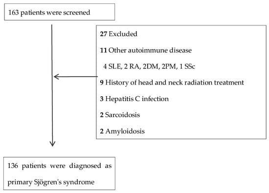 Figure 2. Participant flow diagram: the recruitment of patients with primary Sjögren’s syndrome. DM: dermatomyositis; PM: polymatomyositis; RA: rheumatoid arthritis; SLE: systemic lupus erythematosus; SSc: systemic sclerosis.