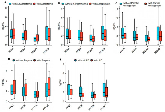 The levels of plasma PFNA (2.0 (1.3, 3.4) ng/mL vs. 1.9 (1.5, 3.3) ng/mL; p = 0.8432) and PFDA (1.7 (1.0, 3.1) ng/mL vs. 1.6 (1.0, 2.1) ng/mL; p = 0.4246) were found to be higher in patients with Sjogren’s syndrome presenting xerostomia compared to those without xerostomia, while the levels of PFUdA (1.2 (0.8, 2.2) ng/mL vs. 1.4 (0.7, 1.7) ng/mL; p = 0.7371) and PFHxS (1.8 (0.9, 3.6) ng/mL vs. 2.4 (1.1, 4.0) ng/mL; p = 0.5769) were lower; however, these differences did not reach statistical significance. The plasma levels of PFNA (2.0 (1.3, 3.7) ng/mL vs. 1.9 (1.4, 3.1) ng/mL; p = 0.8980) and PFUdA (1.2 (0.7, 2.1) ng/mL vs. 1.3 (0.8, 2.0) ng/mL; p = 0.7430) were higher in patients with Sjogren’s syndrome with xerophthalmia than in patients without xerophthalmia, while the level of PFHxS (1.9 (1.0, 3.9) ng/mL vs. 2.1 (0.9, 3.9) ng/mL; p = 0.8694) was lower, but the difference did not reach statistical significance. The plasma levels of PFNA (1.6 (1.3, 2.6) ng/mL vs. 2.1 (1.4, 3.7); p = 0.0979), PFUdA (1.2 (0.8, 1.8) ng/mL vs. 1.3 (0.8, 2.1); p = 0.6078) and PFHxS (1.8 (0.7, 3.2) ng/mL vs. 1.9 (1.0, 4.0); p = 0.3611) were lower in patients with Sjogren’s syndrome with parotid enlargement than in patients without parotid enlargement, but the differences were not statistically significant. The plasma levels of PFNA (2.0 (1.4, 4.3) ng/mL vs. 1.9 (1.4, 3.3); p = 0.7430) and PFHxS (2.3 (1.1, 4.8) ng/mL vs. 1.9 (0.9, 3.6); p = 0.5306) were higher in patients with Sjogren’s syndrome with purpura and lower levels of PFAud than in patients without purpura, but the difference also did not reach statistical significance. The plasma levels of PFAud (1.2 (0.9, 2.2) ng/mL vs. 1.3 (0.8, 2.0); p = 0.8192) were lower in patients with Sjogren’s syndrome with ILD and higher in patients without ILD, but the difference also did not reach statistical significance. The median plasma levels of PDFA were similar between pSS patients who had dry eye symptoms or parotid gland swelling or purple spots on the skin compared to pSS patients who did not have these symptoms; the median plasma levels of PNFA were similar between pSS patients who had interstitial lung disease (ILD) and those who did not have it. The detailed data are shown in Figure 3 and Table S3.