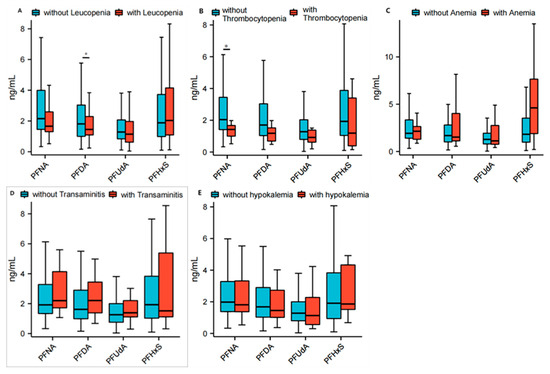 Figure 4. Correlation between PFASs and blood tests for primary Sjögren Syndrome (pSS). Correlation between PFASs, including PFNA, PFDA, PFUdA and PFHxS, and specific abnormal blood tests for pSS, including leukopenia (A), thrombocytopenia (B), anemia (C), transaminitis (D) and hypokalemia (E) in patients with primary Sjögren syndrome. Box charts present the medians (central lines), interquartile ranges (boxes), and minimum and maximum values (whiskers). Student’s t-test was used. * Significant p-value < 0.05. PFASs: perfluoroalkyl substances; PFDA: perfluorodecanoate; PFHxS: perfluorohexane sulfonate; PFNA: perfluorononanoate; PFUdA: perfluoroundecanoate; pSS: primary Sjögren syndrome.