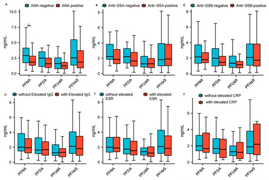 Figure 5. Correlation between PFASs and immunologic indexes of primary Sjögren syndrome (pSS). Correlation between PFASs, including PFNA, PFDA, PFUdA and PFHxS, and specific immunologic indexes of pSS, including antinuclear antibody (ANA) (A), anti-SSA (B), anti-SSB (C), immunoglobulin G (IgG) (D), erythrocyte sedimentation rate (ESR) (E) and C-reactive protein (CRP) (F) in patients with primary Sjögren syndrome. Box charts present the medians (central lines), interquartile ranges (boxes), and minimum and maximum values (whiskers). * Student’s t-test was used. Significant p-value < 0.05. ANA: antinuclear antibody; anti-Ro/SS-A: anti-Sjögren’s syndrome A; anti-La/SS-B: anti-Sjögren’s syndrome B; CRP: C-reactive protein; ESR: erythrocyte sedimentation rate; IgG: immunoglobulin G; PFASs: perfluoroalkyl substances; PFDA: perfluorodecanoate; PFHxS: perfluorohexane sulfonate; PFNA: perfluorononanoate; PFUdA: perfluoroundecanoate; pSS: primary Sjögren syndrome.