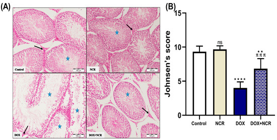 Furthermore, the changes in spermatogenesis between the different groups was estimated using Johnsen’s score. DOX-intoxicated rats indicated a marked decline in Johnsen’s score compared to the control and NCR-treated groups. Additionally, a substantial increment in such scores was observed in the testes of the DOX+NCR-treated rats compared with the DOX-intoxicated group. Furthermore, the NCR group demonstrated a significant advancement in Johnsen’s score prior to that of the control group (Figure 2B).