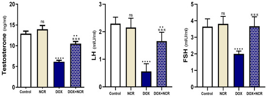 Effects of NCR treatments on serum reproductive hormones in testicular toxicity induced by DOX in the rat model. Data are expressed as mean ± SD (n = 8/group) (ns; nonsignificant, ** p ≤ 0.05, **** p ≤ 0.001 vs. control group, and π π π p ≤ 0.001 vs. DOX group).