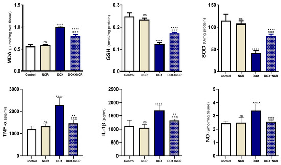 NCR reduces testicular oxidative stress and inflammatory biomarkers in DOX-intoxicated rats. Treating rats with NCR decreased MDA and NO, TNF-α, and IL-1β; moreover, NCR administration increased GSH level and SOD activity. Data are expressed as mean ± SD (n = 8/group) (ns; nonsignificant, ** p ≤ 0.05, **** p ≤ 0.001 vs. control group, and π π π p ≤ 0.001 vs. DOX group).