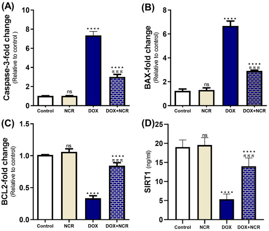 Figure 5 shows that treatment with NCR significantly attenuated the reduction in the gene expression of key apoptotic and survival markers induced by DOX, specifically, caspase-3, BCL2, and Bax, which were qRT-PCR evaluated. In the DOX-treated group, caspase-3 (7.352 ± 0.4 vs. 1.01 ± 0.00-fold change to control, p ≤ 0.001) and Bax (6.68 ± 0.4 vs. 1.24 ± 0.2-fold change to control, p ≤ 0.001) expressions were significantly elevated, consistent with the induction of apoptosis. On the other hand, downregulation of BCL2 (0.34 ± 0.03 vs. 1.01 ± 0.00-fold change to control, p ≤ 0.001) occurred. However, in the NCR +DOX co-treated group, caspase-3 expression levels were significantly reduced compared to DOX (3.01 ± 0.26 vs. 7.352 ± 0.4-fold change to control, p ≤ 0.001), indicating that NCR mitigated the apoptotic signaling also by decreasing Bax expression (2.9 ± 0.05 vs. 6.68 ± 0.4-fold change to control, p ≤ 0.001). In addition, a restoration of BCL2 expression (0.84 ± 0.04 vs. 0.34 ± 0.03-fold change to control, p ≤ 0.001) in the NCR-treated group was found compared to the DOX-only group (Figure 5).