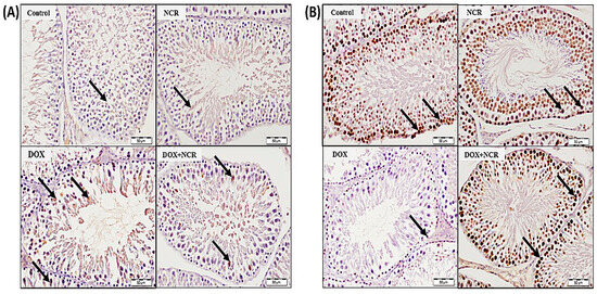 Apoptosis is a significant mechanism by which DOX induces testicular toxicity. DOX upregulates the testicular expression of Bax and caspase-3 and downregulates Bcl2 gene expression [18]. Upregulation of Bax, combined with the downregulation of Bcl-2, disrupts mitochondrial integrity, initiating the activation of caspase-3. This cascade leads to DNA fragmentation, membrane blebbing, and cellular detachment [47]. Conspicuously, caspase-3 activation in germ cells is closely linked to the sloughing of these cells from the seminiferous epithelium [48,49]. In this study, NCR was found to inhibit DOX-induced apoptosis by modulating apoptotic signaling pathways. It prevented the activation of caspases and enhanced the upregulation of Bcl-2, the anti-apoptotic proteins.