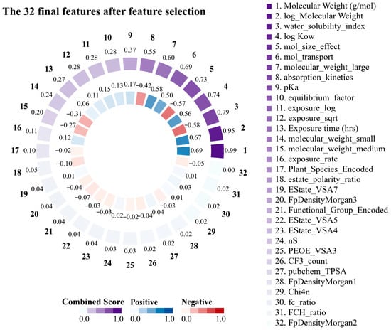 Striking relationships were identified between the key structural and physicochemical features of the PFAS by examining the correlation matrix. The 32 features obtained through feature engineering are shown in Figure 2. This demonstrated that the molecular weight of PFASs emerged as the most important feature in predicting translocation behavior in plants, exhibiting a correlation of 0.69 with the log RCF and a composite score of 0.98. logKow exhibited a moderate positive correlation (0.57) with log RCF, with a characteristic significance of 0.02 and a composite score of 0.74, indicating that the hydrophobicity of PFASs significantly affected their transport behavior. Conversely, the water solubility index, which is based on the topological polar surface area (TPSA)/(Molecular Weight × (1 + 0.5 × log Kow)), is a composite feature. This index had a significant predictive value (feature significance of 0.26) and integrated multiple key parameters that affect the water solubility of PFASs. The data substantiated this feature’s robust negative correlation (−0.58) with the target variable, indicating that higher-molecular-weight PFASs with lower water solubility accumulate more easily in plant roots [,]. In addition, particular consideration should be given to the interaction of exposure time when designing kinetic features. Absorption kinetics was based on the following equation: (1 − exp (−0.005 × Exposure time)). This is further supported by the correlation of −0.42 with the target variable and a composite score of 0.56. This suggests that this feature captured the time-dependent and hydrophobic barriers to PFAS absorption. In summary, the advantages of molecular weight as a predictor, combined with the significant contributions of hydrophobicity and water solubility indices, indicate that PFAS transport in hydroponic plant systems follows a visible structure–activity relationship. By elucidating these structure-dependent transport mechanisms, we can better predict PFAS’s environmental mobility and bioaccumulation potential.