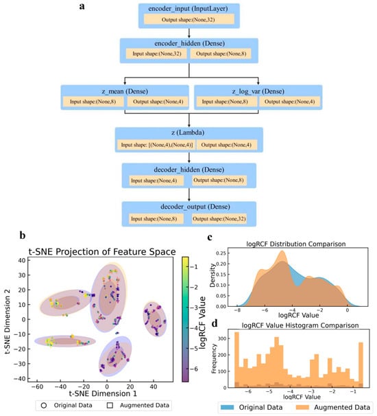 The augmentation method used in this study addresses the core challenges of regression modeling scenarios with limited sample sizes and complex data distributions. A statistical comparison of the target variables before and after augmentation is presented in Table S4. The structure of the VAE model used in the enhancement method is shown in Figure 3a. This model achieved effective dimensionality reduction and retained key information regarding the data features. It also enhanced the generation ability and data diversity of the model using a random sampling mechanism of mean and variance. The t-distributed stochastic neighbor embedding (t-SNE) [] feature space projection diagram (Figure 3b) revealed the topological preservation ability and local density optimization effect of the data augmentation algorithm. The multiple discrete cluster structures formed by the original data (purple) were effectively retained by the enhanced data (orange). Concurrently, the enhanced samples effectively occupied the low-density regions within and surrounding the clusters, thereby markedly enhancing sample coverage without inducing unnatural clusters. The multi-peak nature of the log RCF distribution plot indicated that the target variable may have originated from multiple underlying mechanisms. Furthermore, the enhancement algorithm effectively preserved this intricate distribution structure through adaptive binning []. The density curve (Figure 3c) demonstrates that the augmentation process achieved moderate distribution smoothing. The original data (blue) appears to have a more concentrated distribution with a notable peak around −3, while the augmented data (orange) shows a wider, more spread-out distribution with multiple peaks around −5, −3, and closer to −1. This demonstrated that the augmentation process effectively expanded the distribution to cover the entire range of log RCF values, particularly by enhancing the representation of previously underrepresented regions. The histogram (Figure 3d) further illustrates this transformation with the frequency counts before and after augmentation. The orange bars (augmented data) show significantly higher counts across the entire range of log RCF values, with particularly strong representation at the extremes (−6 and −1) and the middle range (−4). This confirmed that the data augmentation strategy successfully increased the sample size while maintaining the general shape of the original distribution but enhanced coverage in previously sparse areas.