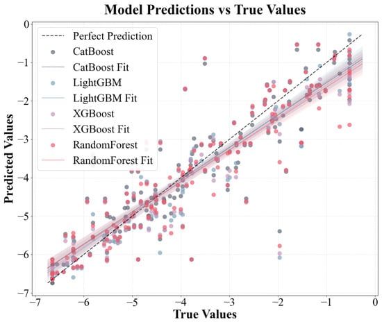 We implemented four types of algorithms that are considered the most effective for improving the prediction accuracy in this study []. The CatBoost regressor [], a sophisticated gradient-boosting implementation, has demonstrated superior performance in predicting PFAS bioaccumulation in groundwater [] through its innovative ordered boosting algorithm, which minimizes prediction shifts arising from target leakage. CatBoost can be computationally intensive for large datasets and may require extensive hyperparameter tuning to achieve optimal performance. The LightGBM [] uses a histogram-based decision-tree growth strategy that discretizes continuous features into optimal bins, dramatically reducing memory requirements while preserving statistical fidelity. However, LightGBM is sensitive to small datasets and may suffer from overfitting when the number of samples is limited relative to the features. The XGBoost algorithm [] addresses high-dimensional sparsity and multicollinearity in the molecular descriptor space through its distinctive regularization framework, which combines L1 and L2 penalties. Despite its strengths, XGBoost is prone to overfitting noisy data and requires careful parameter tuning to balance the bias and variance trade-offs. The RF model [] builds a low-correlation decision tree integration by combining bootstrap aggregation with random feature subset selection at each node split, thereby providing robustness against overfitting and inherent variance reduction through ensemble averaging. However, RF may struggle with extrapolation beyond the training data range and may be biased toward features with more levels of categorical variables. The detailed differences are listed in Table S3.